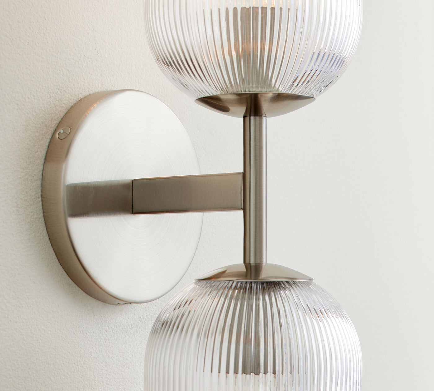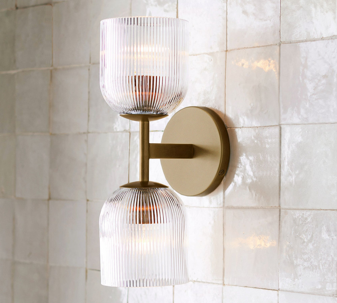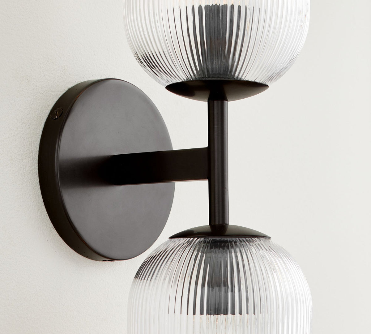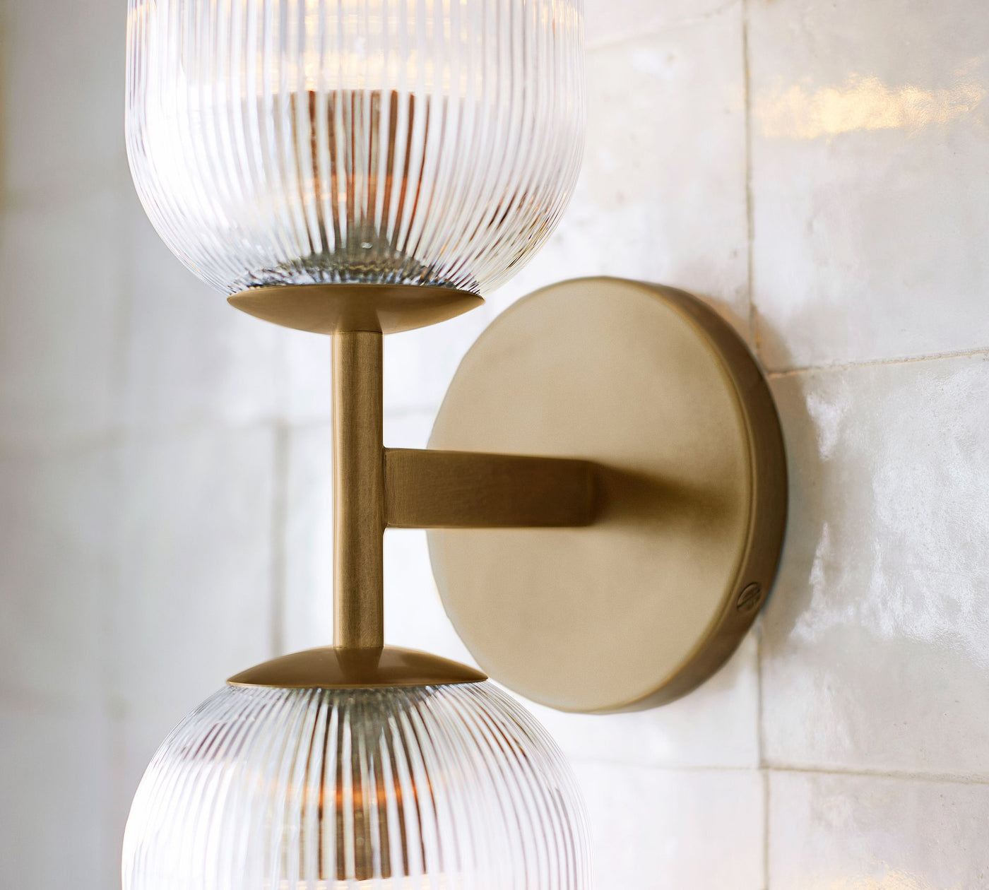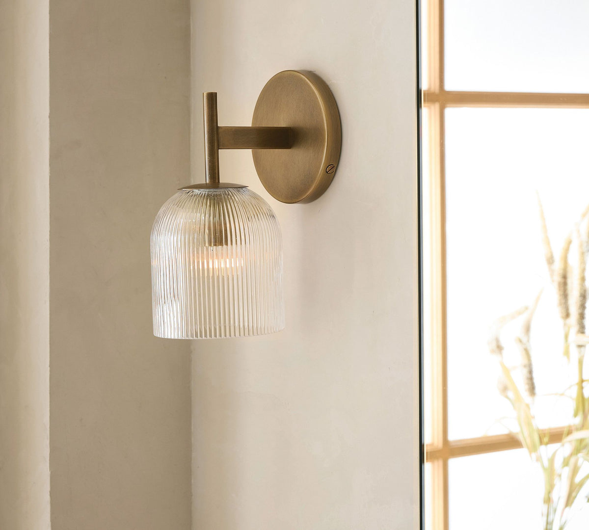 Elevate any space with the Bravira Ribbed Glass Sconce, designed for both style and function. Made of iron in Antique Bronze, Satin Nickel, or Tumbled Brass finishes, with a hand-blown clear glass shade. Ideal for use as a bedroom wall sconce, hallway light, or decorative accent in living areas.