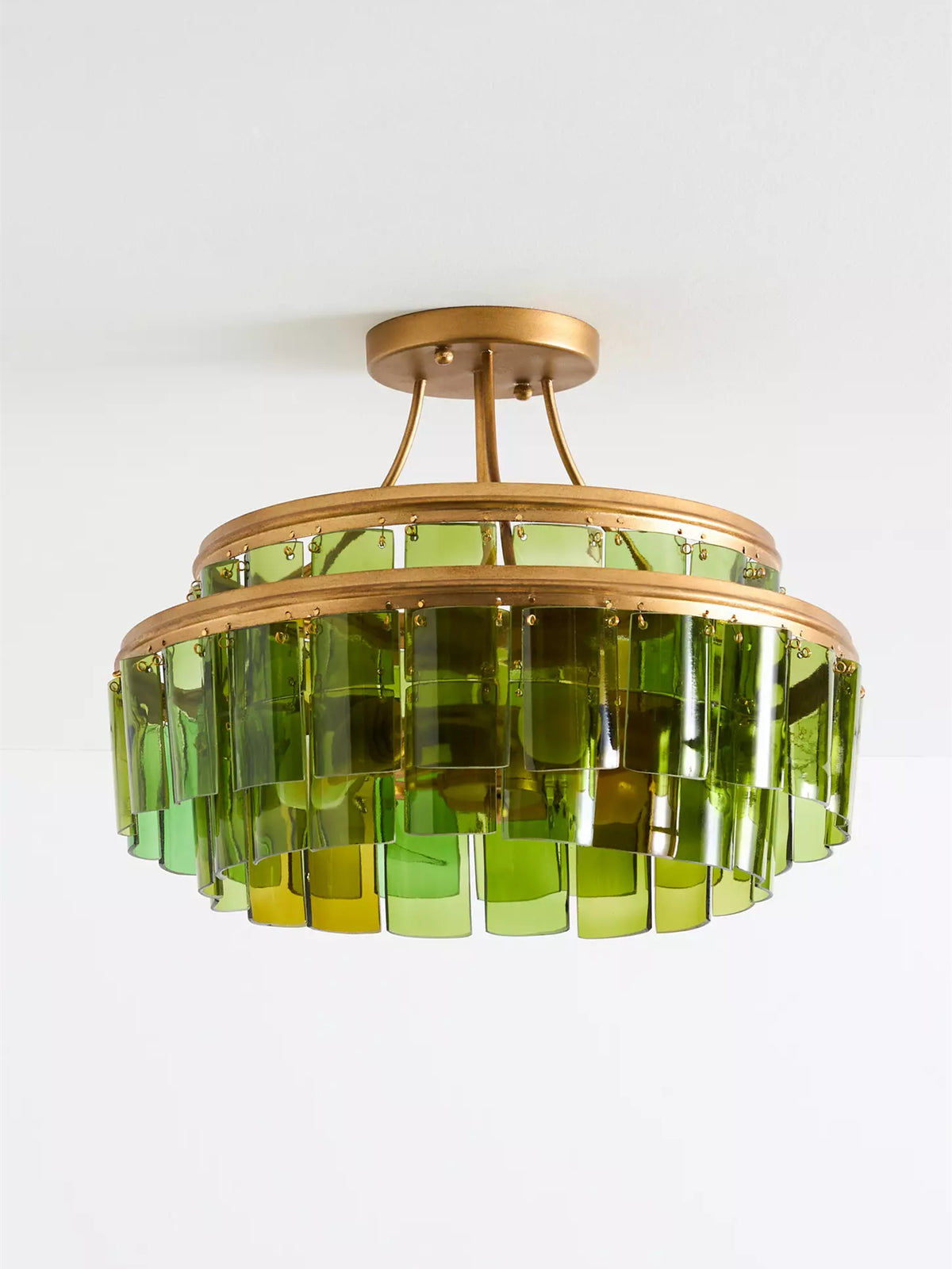The Glass Semi-Flush Mount features individually cut recycled green glass cascading from a contemporary gold frame. This modern ceiling light delivers a soft, textured glow, perfect for dining rooms, entryways, or bedrooms seeking eco-friendly elegance with unique style.