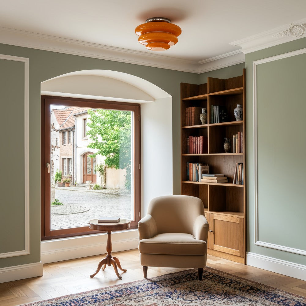 The Cirren Ceiling Lamp showcases a sculptural circular form inspired by layered geometry, creating a refined visual rhythm on the ceiling. Its stacked ring design softly diffuses light, delivering balanced ambient illumination that enhances modern interiors, including living rooms and entryways.