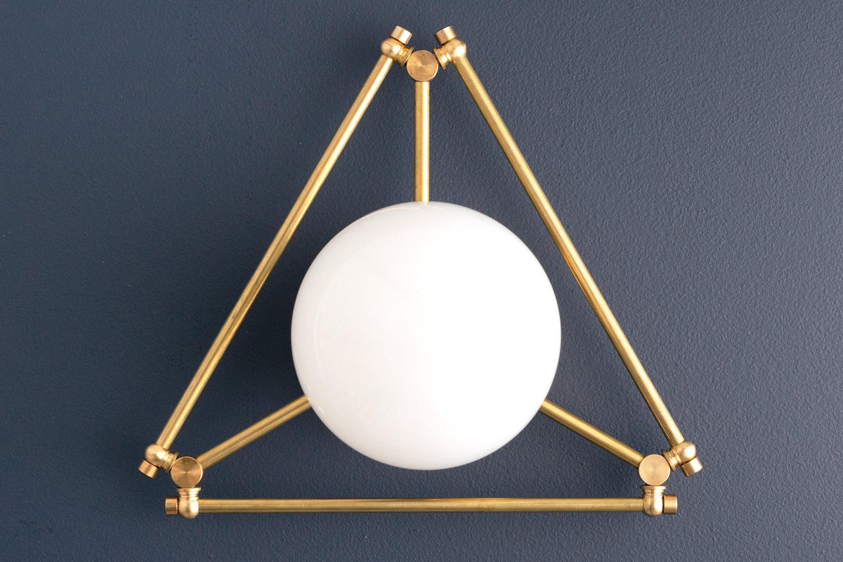 Elevate your space with this artisan-crafted modern deco ceiling light. Its hand-blown 6" globe and geometric design create a striking visual statement. Finished in raw brass that develops a unique patina over time, adding character to any room. Perfect for contemporary interiors seeking a touch of organic elegance.