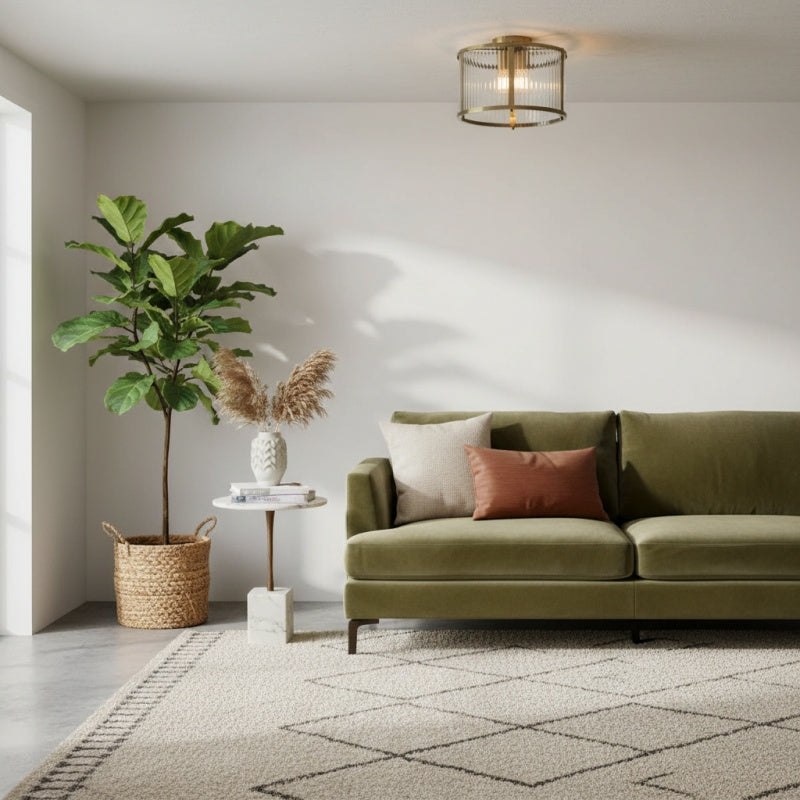 This timeless RibGlow ceiling light perfectly blends exquisite metal craftsmanship with elegant ribbed glass, creating soft and even lighting to elevate your home's ambiance. The fixture features a metal-plated frame and a transparent ribbed glass shade that gently diffuses light throughout the room.