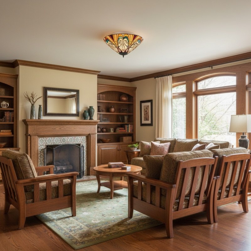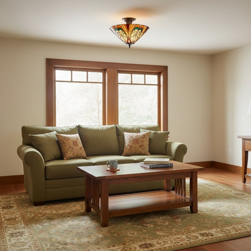 The ceiling light features rich stained glass in swirling Art Nouveau patterns. Semi-flush and flush versions suit low ceilings while the pendant offers adjustable drop height. Each handcrafted shade creates warm colorful ambient lighting for living rooms dining areas hallways or bedrooms.