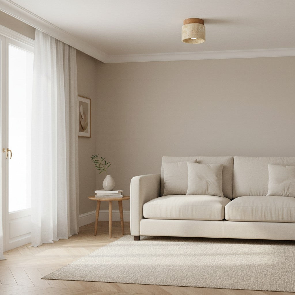 This sculptural ceiling light features an organic silhouette crafted from yellow marble and wood, softly diffusing warm ambient light. Its contemporary design complements modern and minimalist interiors, delivering even illumination for living rooms, dining areas, bedrooms, and multifunctional spaces.