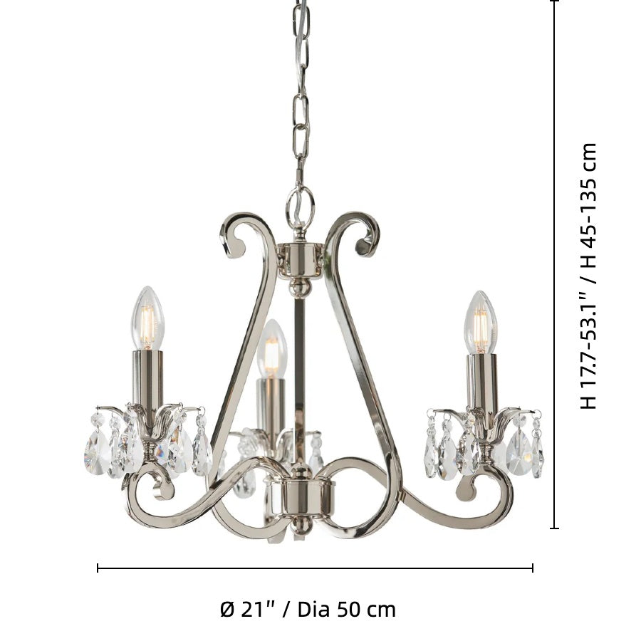 This exquisite fixture features gracefully sweeping arms, adorned with delicate crystal droplets and shades that sparkle with every reflection. Its adjustable chain allows for versatile installation in living rooms, dining areas, or high-ceiling foyers, casting a warm and inviting glow.