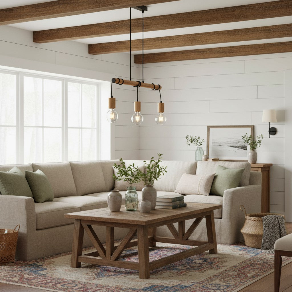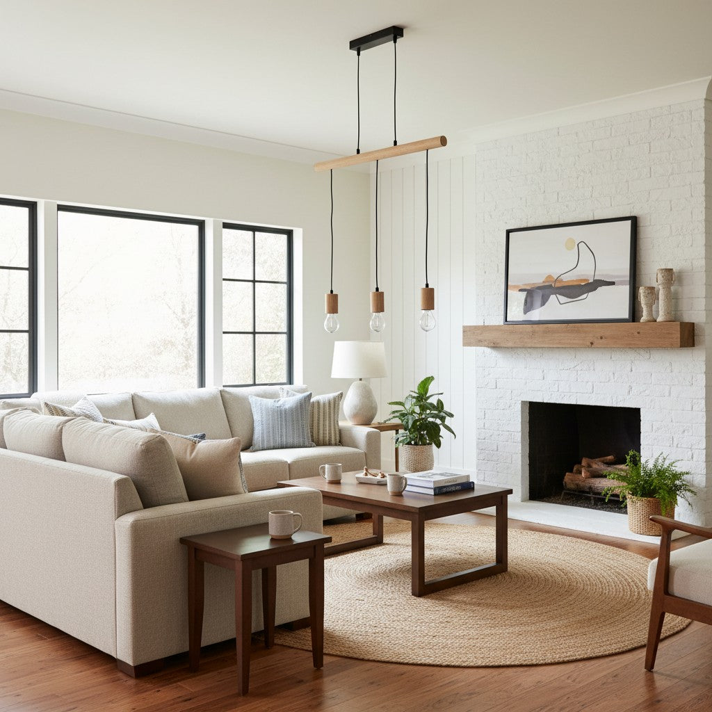 Virell Adjustable Linear Ceiling Light – 3‑Bulb Wooden and Metal Design for Kitchen Island or Office