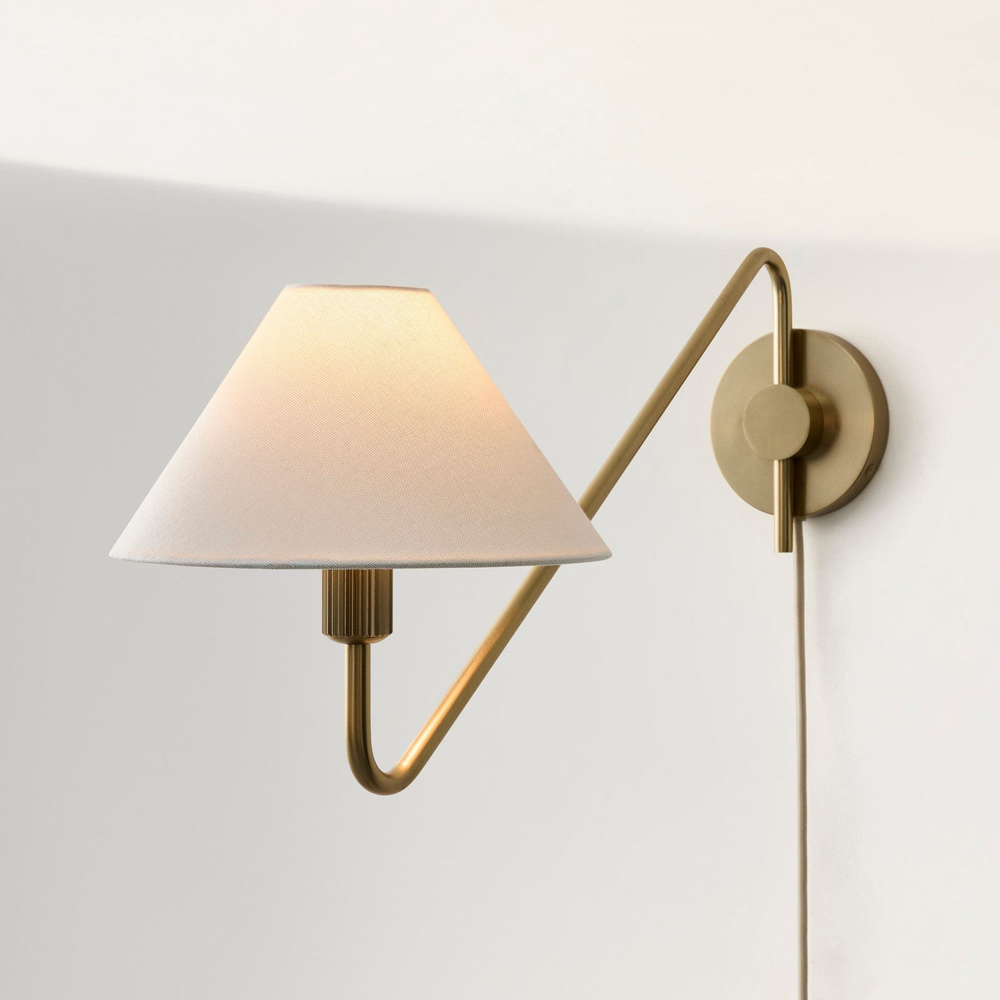 Refresh your décor with this plug-in wall sconce in a chic champagne bronze finish. The adjustable arm design provides directional lighting, while the white linen shade creates a warm and inviting glow. A stylish blend of modern proportions and timeless design, perfect for living rooms, reading nooks, or entryways.