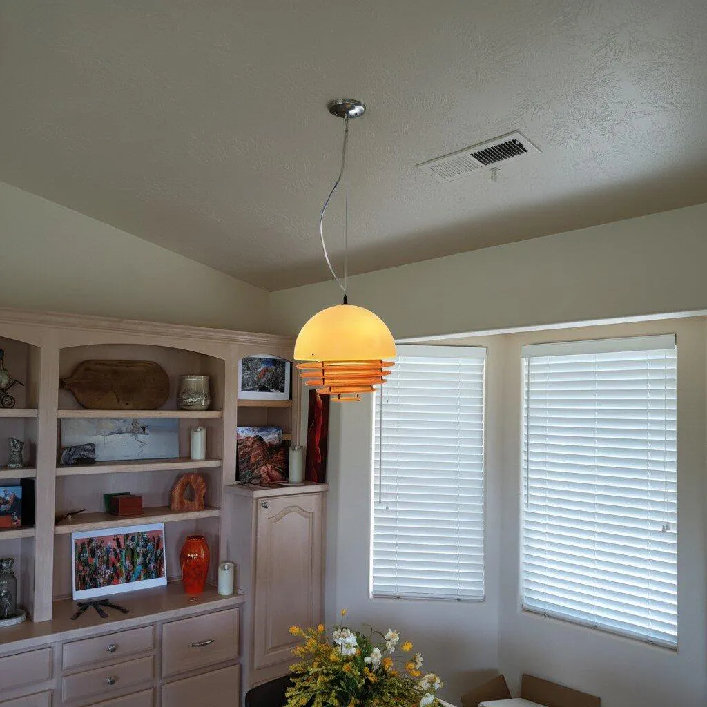 Illuminate your space with the calming glow of this sunset pendant light. Its unique orange and blue hues create a peaceful mood, perfect for adding character to your home. The sleek, Bauhaus-inspired design suits contemporary interiors effortlessly.