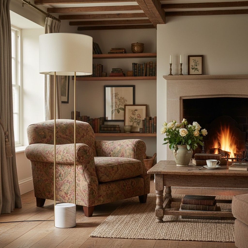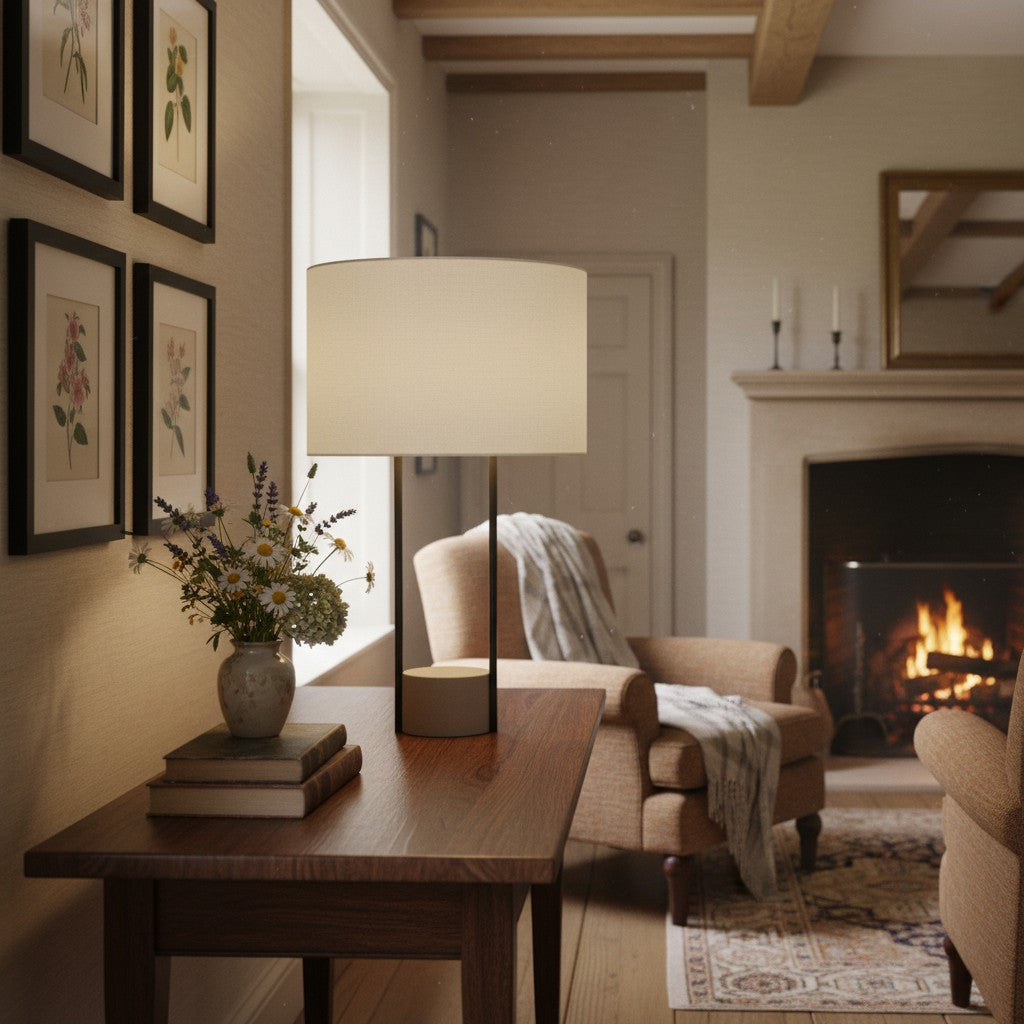 - Mixed-Material Construction: Concrete, marble base paired with linen shade.