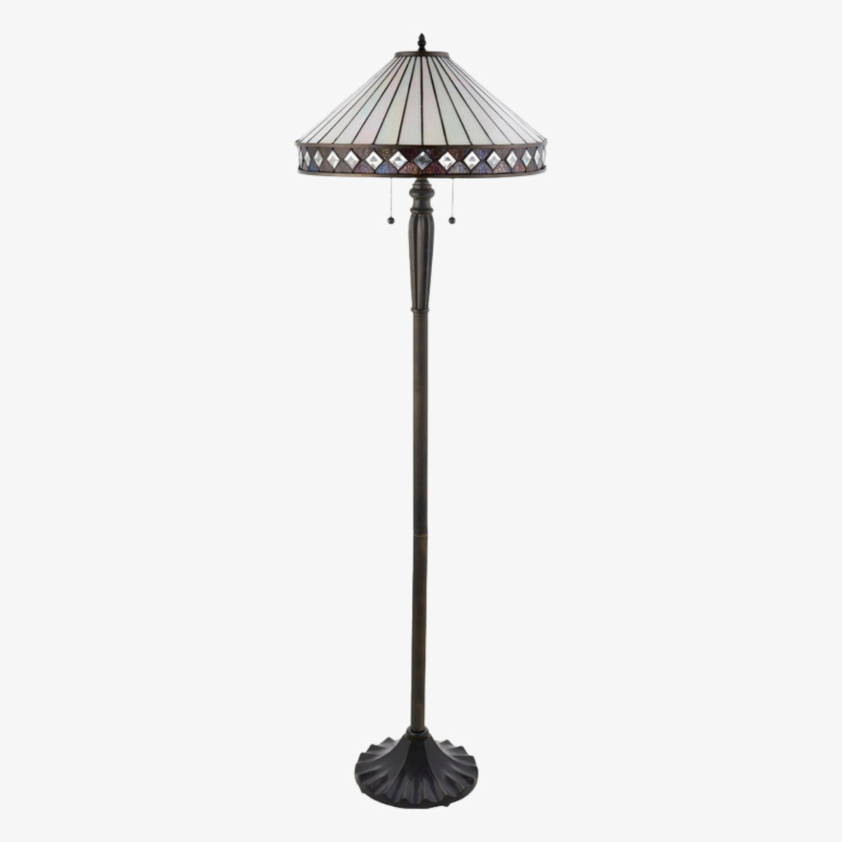 TiffStar floor lamps showcase hand-crafted stained glass with nature motifs or Deco geometry, projecting soft patterned light. Their tall, elegant form enhances living rooms, bedrooms, and studies, adding warm ambience and refined visual detail. Suitable for reading corners or accent lighting.