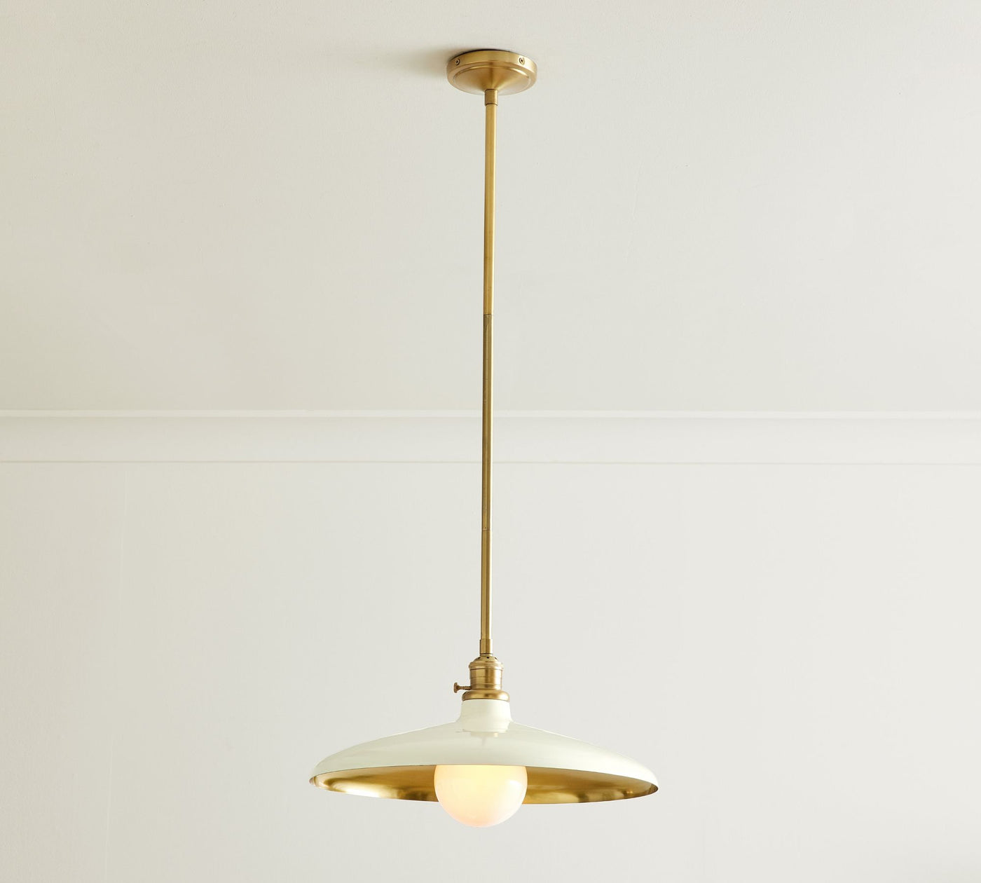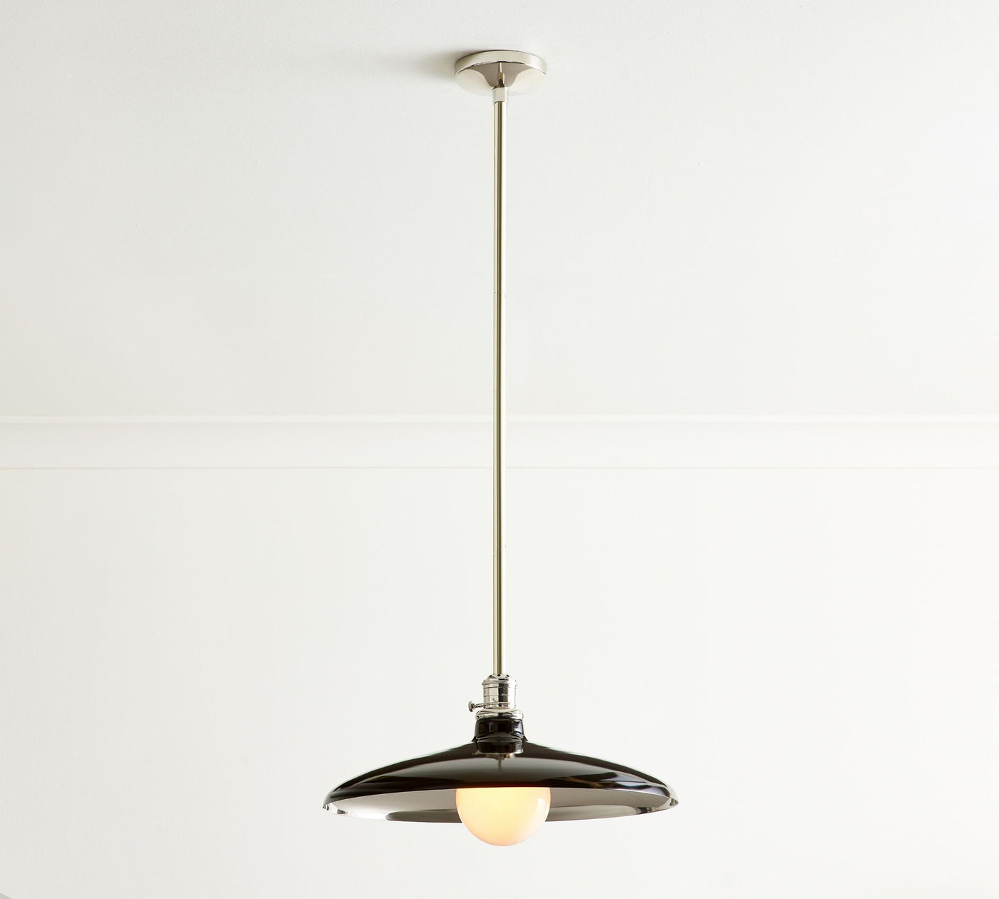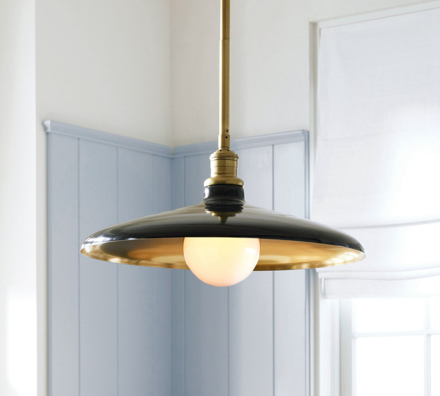 - Crafted of iron and zinc with a Gloss Black or Warm White finishes with an interior choice of Polished Nickel or Tumbled Brass.