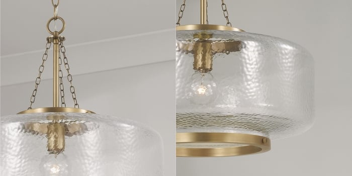 This modern farmhouse pendant light features a timeless glass cloche shade with textured hammered glass, adding warmth and charm to your kitchen island, dining area, or entryway. A stylish vintage-inspired hanging light for cozy, rustic interiors.