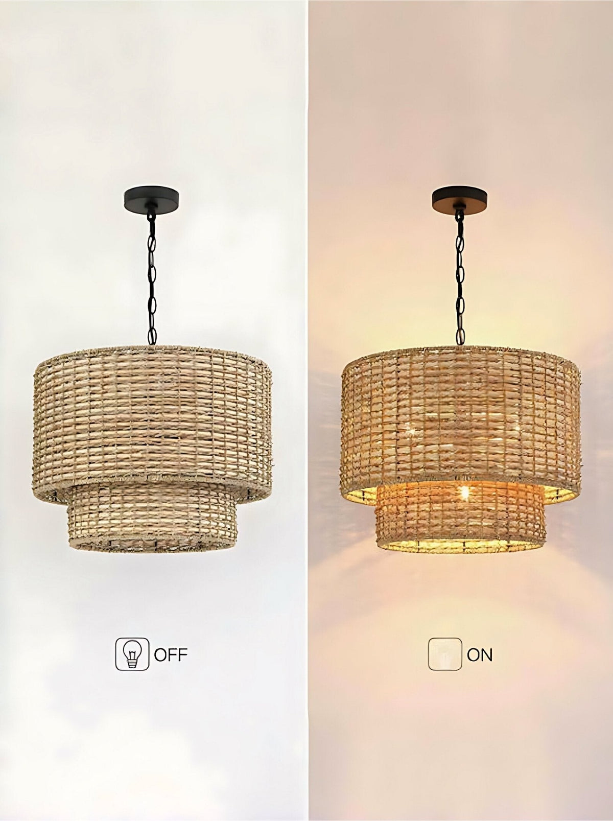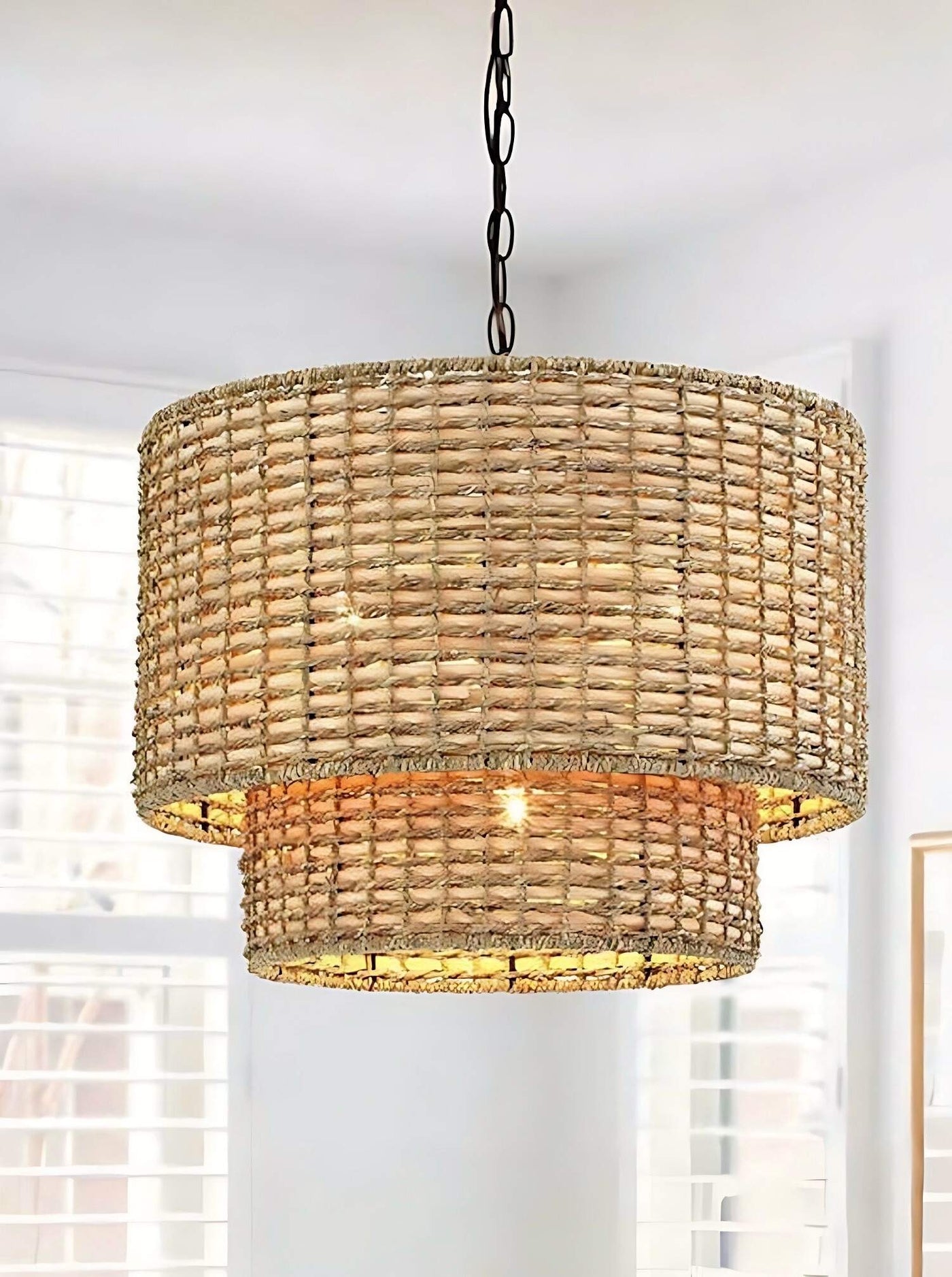 The Natural Rattan Double Drum Pendant Light, carefully beachy hand-woven from natural rattan and bamboo with a two-tiered drum silhouette and four bulbs, this hanging rattan light casts plenty of light and is perfect for a wide range of décor styles, making it a great choice for furniture. This bohemian rattan pendant light is perfect for a variety of settings, including bedrooms, kitchens, living rooms and kitchen islands. Its natural materials and warm light create a cozy atmosphere that enhances any interior.