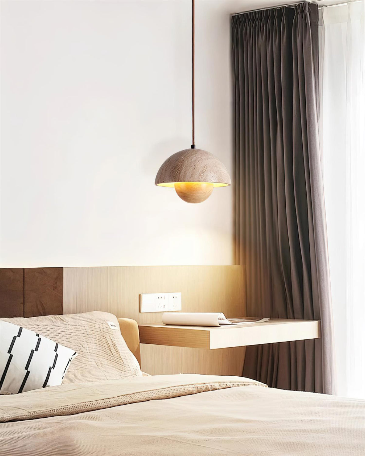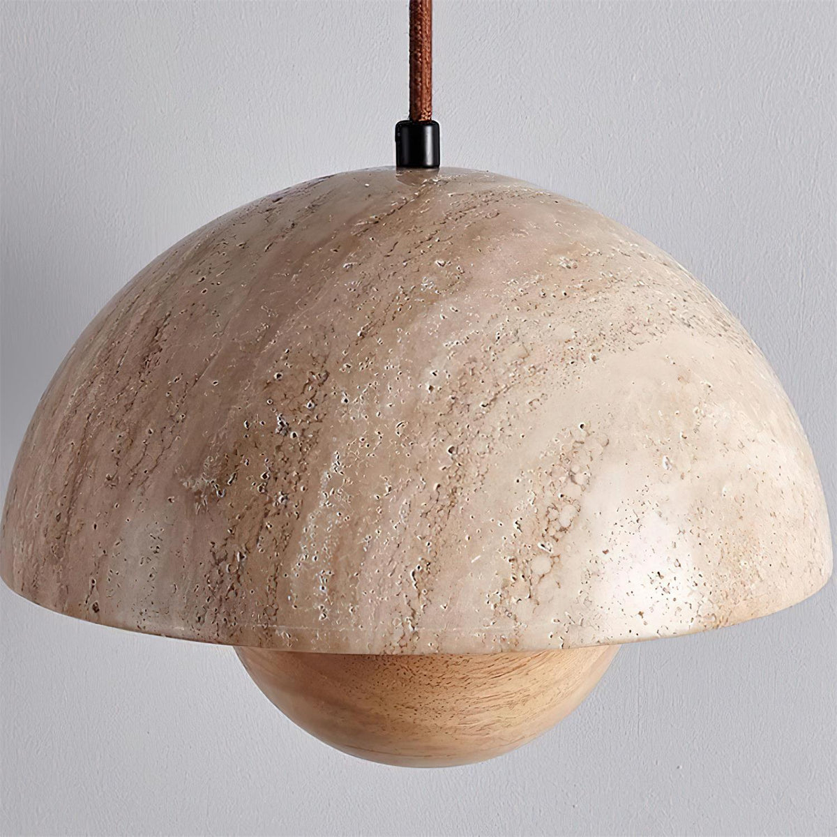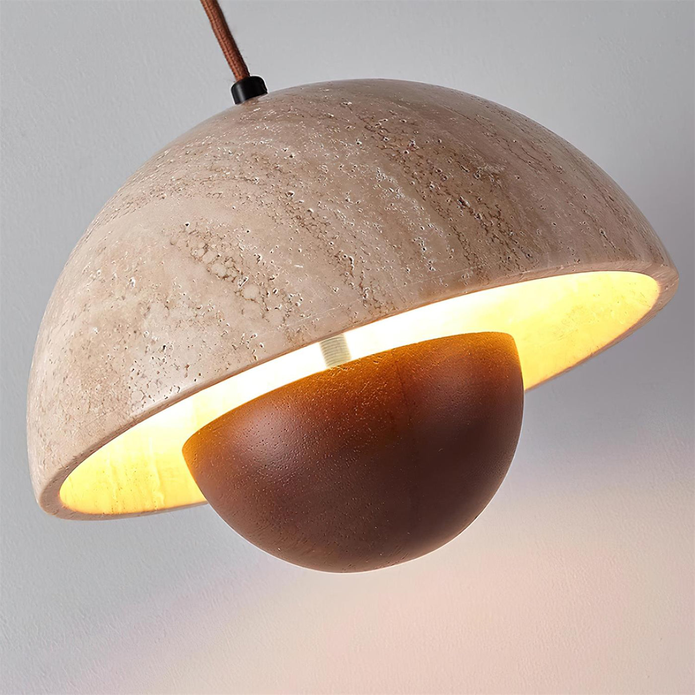 Elevate your interior with the Natural Travertine Semicircular Pendant Lamp, a masterpiece of natural elegance and contemporary design. Featuring a travertine stone dome paired with a wooden sphere, this pendant light exudes a harmonious blend of earthy textures and modern aesthetics. creates a cozy ambiance, making it a versatile addition to any space.
