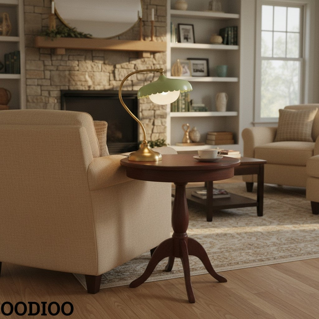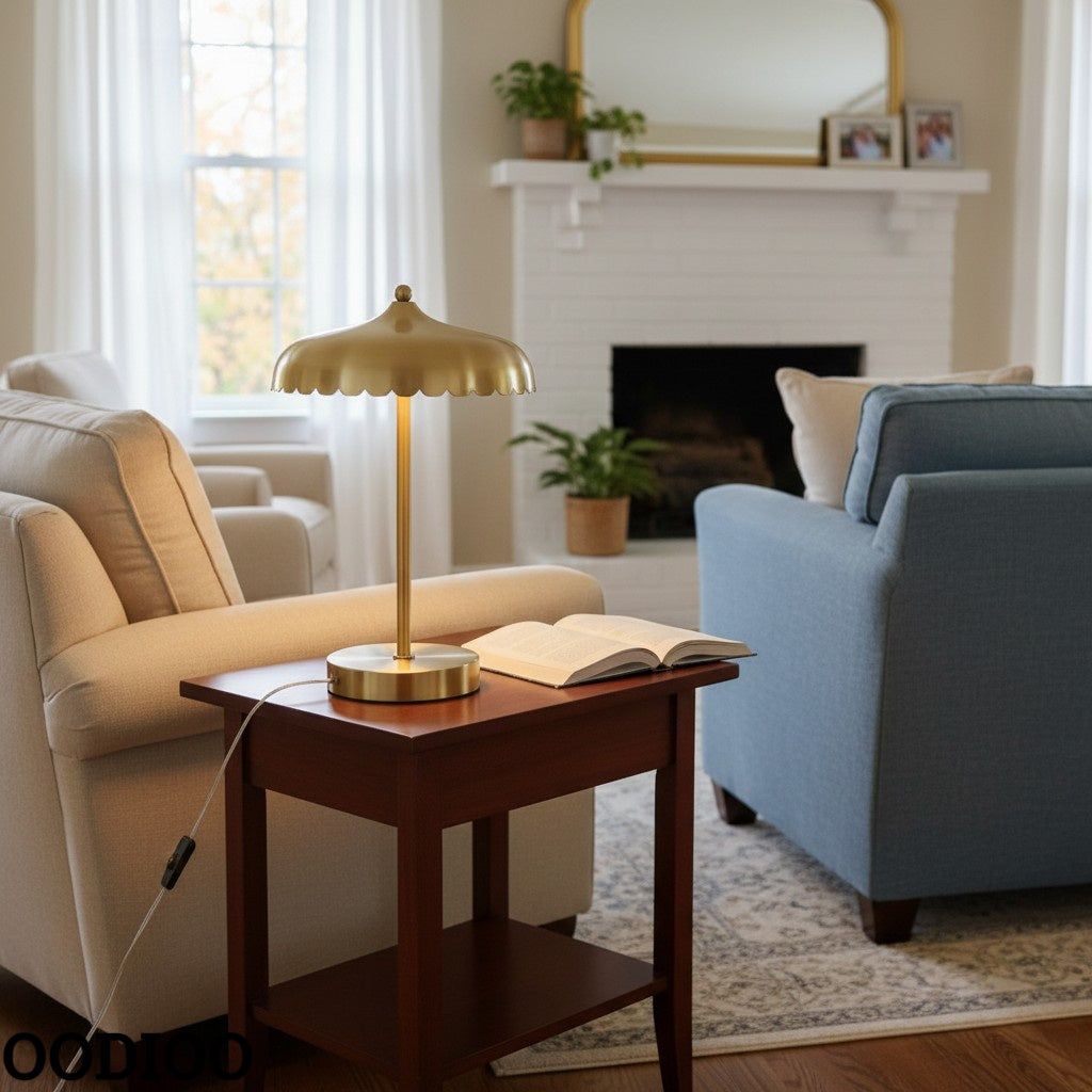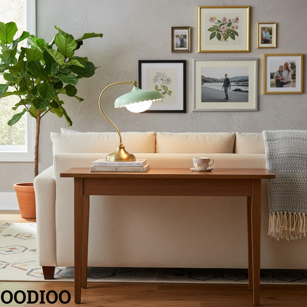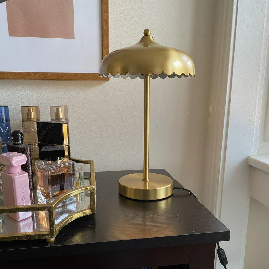 The Rayla Vintage Brass Finish Table Lamp combines retro elegance with functional design, featuring a fixed, colored glass shade and an elegantly curved metal base. This scalloped table lamp brings a vintage-inspired aesthetic while emitting light rays with soft edges that create a cozy ambiance. Ideal for adding a touch of style to your workspace, study, or living area.