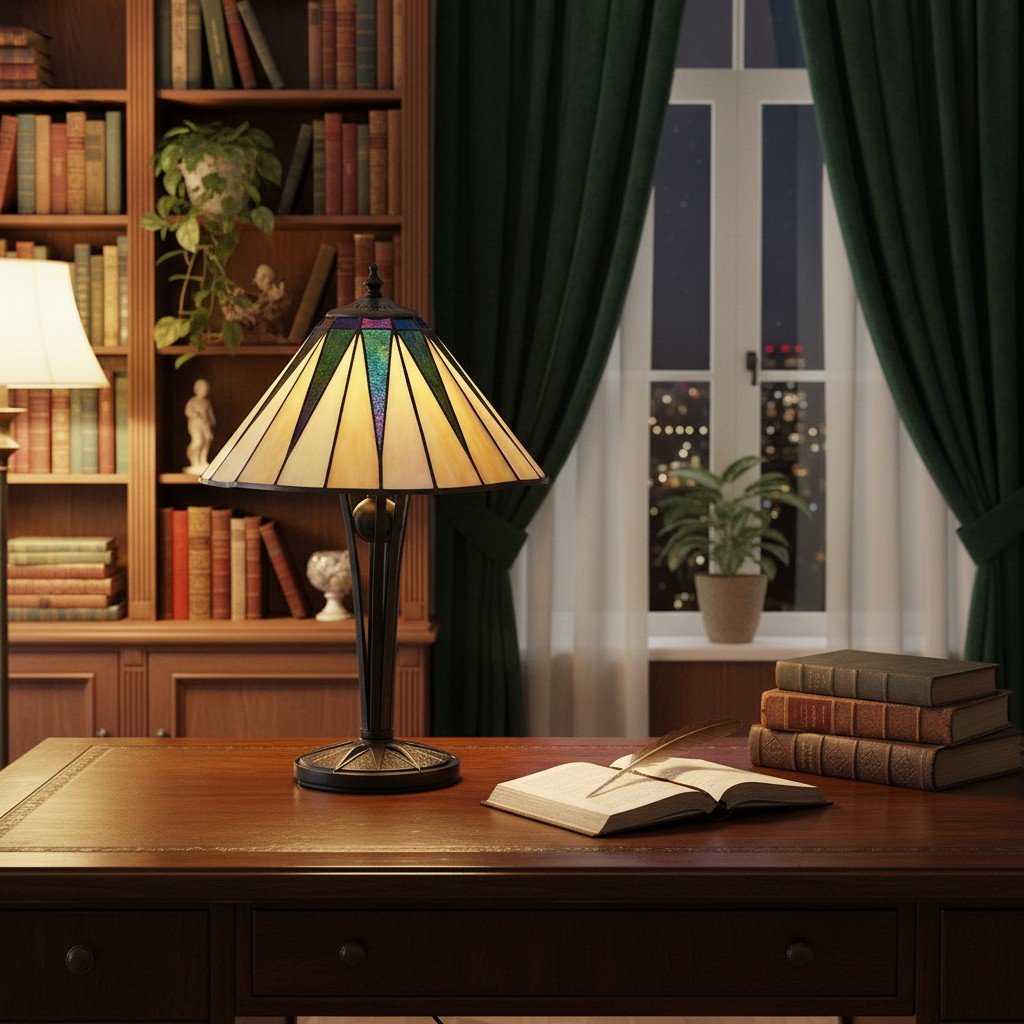 Bring a warm, artistic glow to your space with this handcrafted Tiffany-style table lamp. Its mosaic-inspired shade, geometric patterning, and soft ambient illumination create a striking focal point while maintaining a timeless, classic aesthetic.