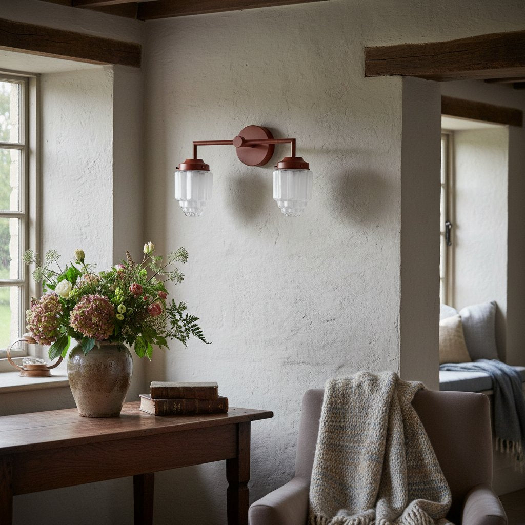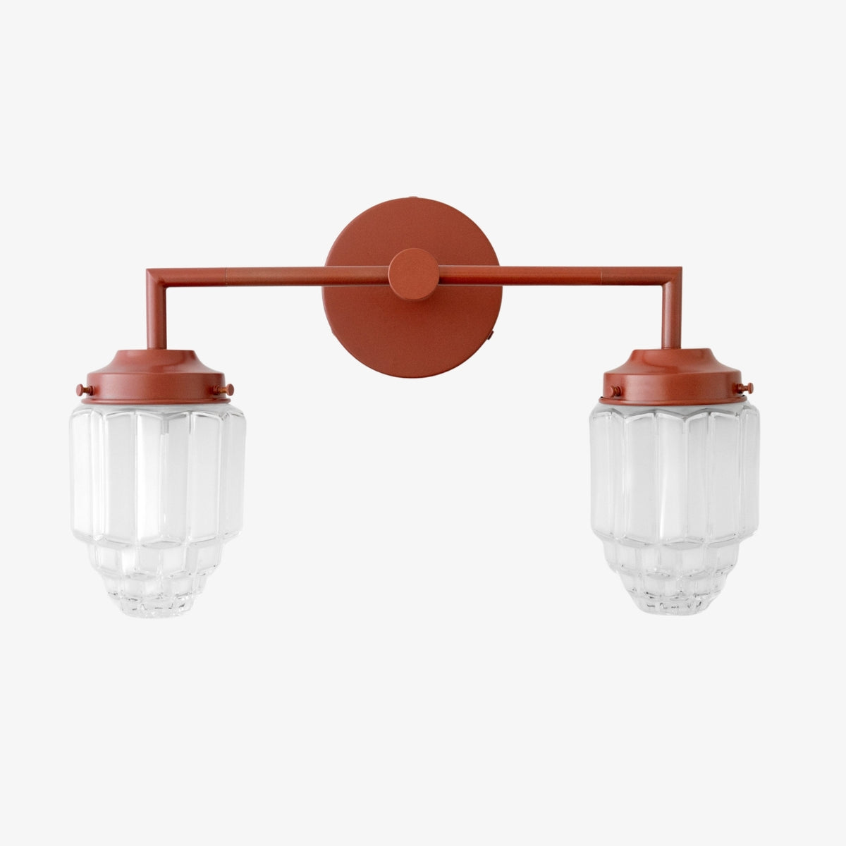 The Tierlux Glass vanity light reflects the elegance of the Art Deco era with its colorful accents and geometric design. Featuring frosted glass skyscraper globes, this wall light adds a vibrant touch to your bathroom or living space. A perfect balance of bold style and soft lighting.