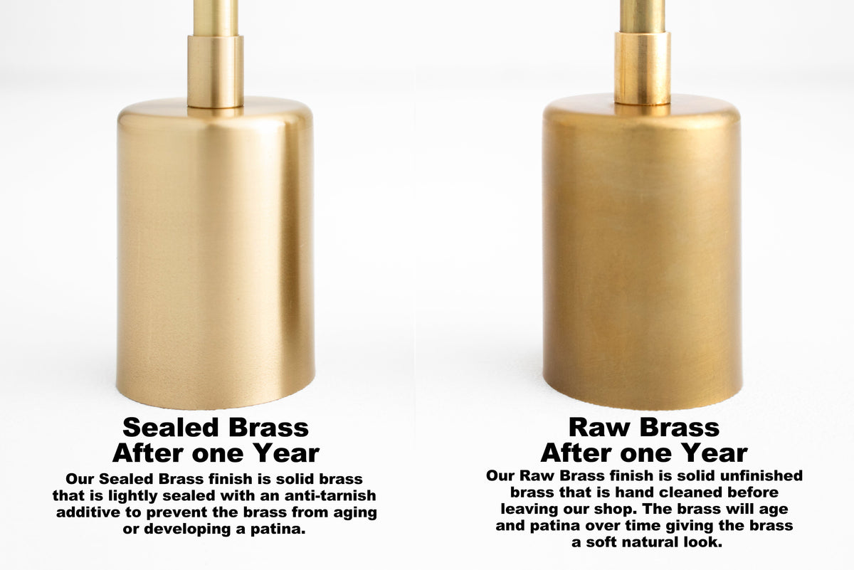 - Our Raw Brass finish features solid unfinished brass that is hand cleaned before leaving our shop. The brass will age and patina over time giving the finish a soft natural look. Please wear gloves while installing all fixtures. Touching raw brass with bare hands will tarnish the brass.