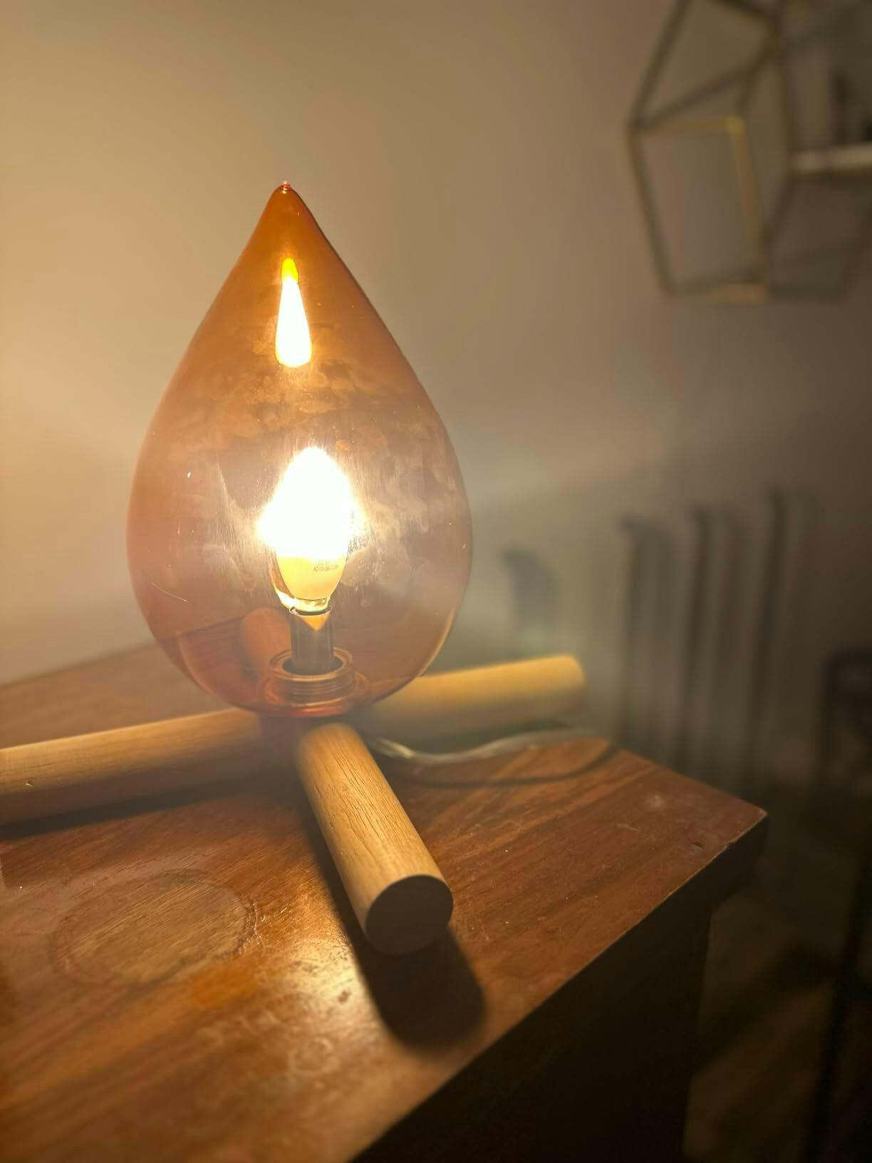 This playful and compact lamp features a vibrant glass orange shade, supported by a base of two crossed wooden sticks for stability. Its design brings to life the charm of a pixelated game, as if a character has jumped straight out of the screen into your room!