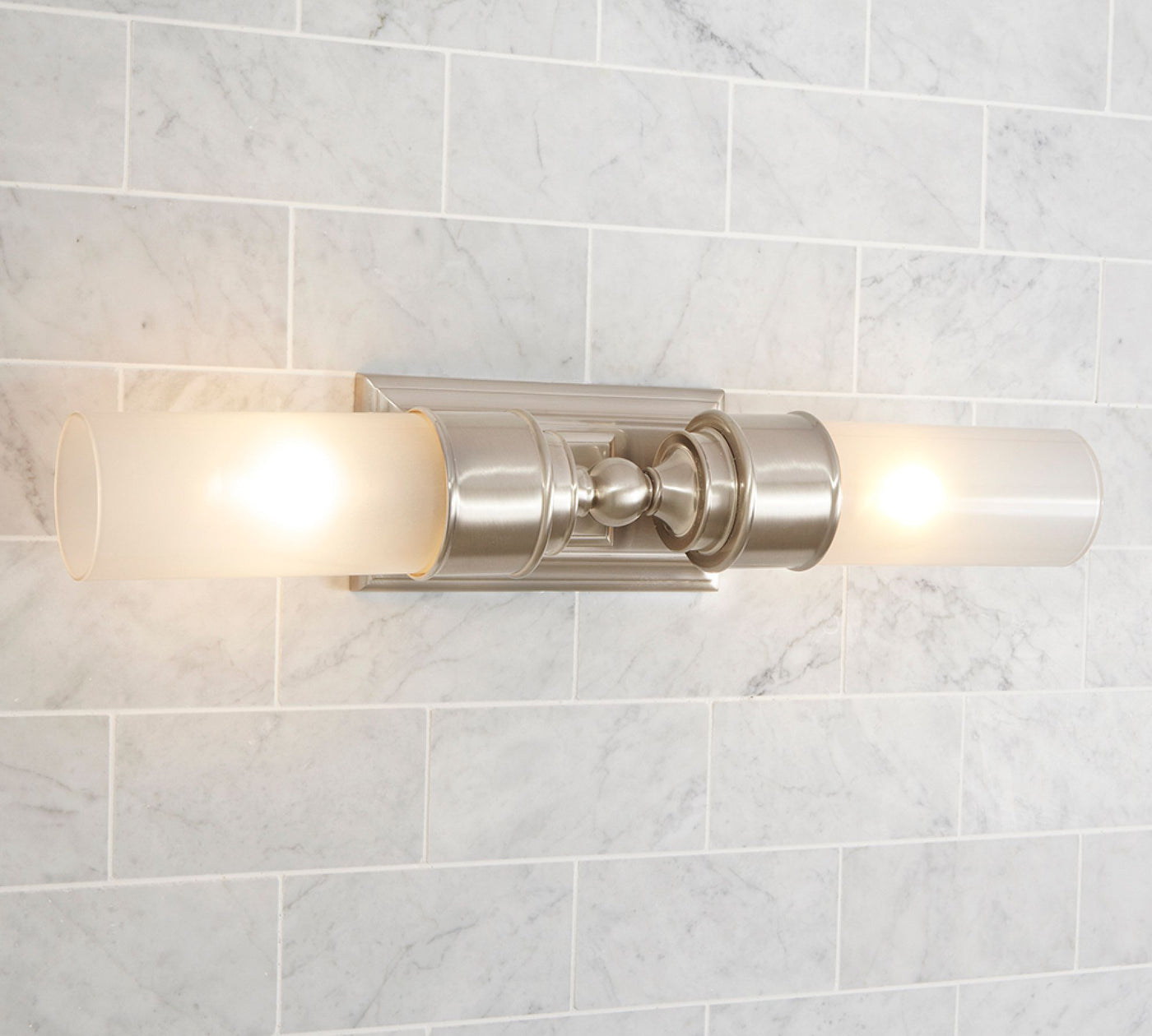 Bring warmth and elegance to your interiors with the Double Tube Sconce. Featuring frosted glass tubes and a metal base available in Chrome, Satin Nickel, or Tumbled Brass, this fixture works beautifully as a bedroom sconce, hallway wall light, or living room accent lamp.