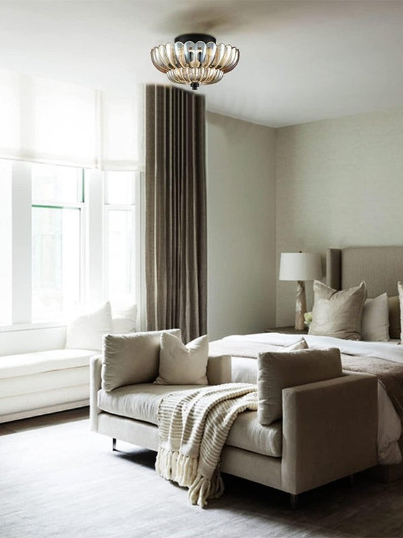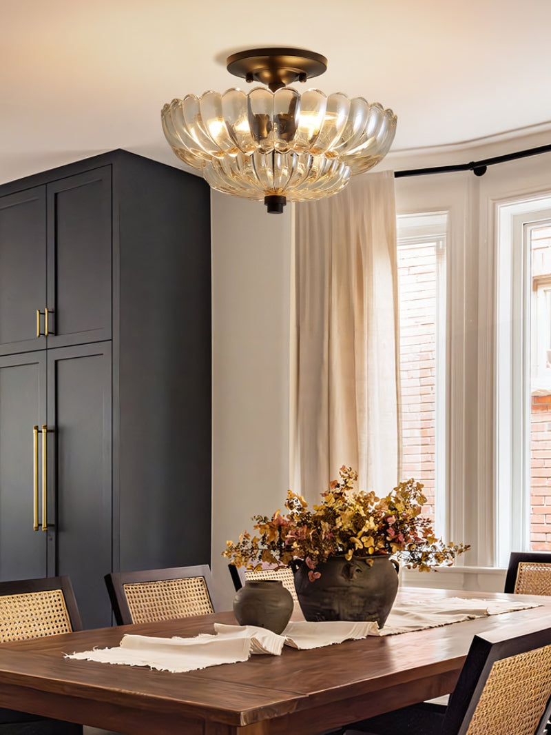 The Vintage Glass Double Layer Floral Black Ceiling Light exudes timeless charm with its intricately layered glass petals, reminiscent of blooming blossoms frozen in delicate clarity. The soft, diffused light radiates through the floral motifs, casting a warm, romantic glow. Ideal for eclectic dining rooms, vintage-inspired bedrooms, or cozy parlors, this piece offers a poetic blend of artistry and nostalgia.